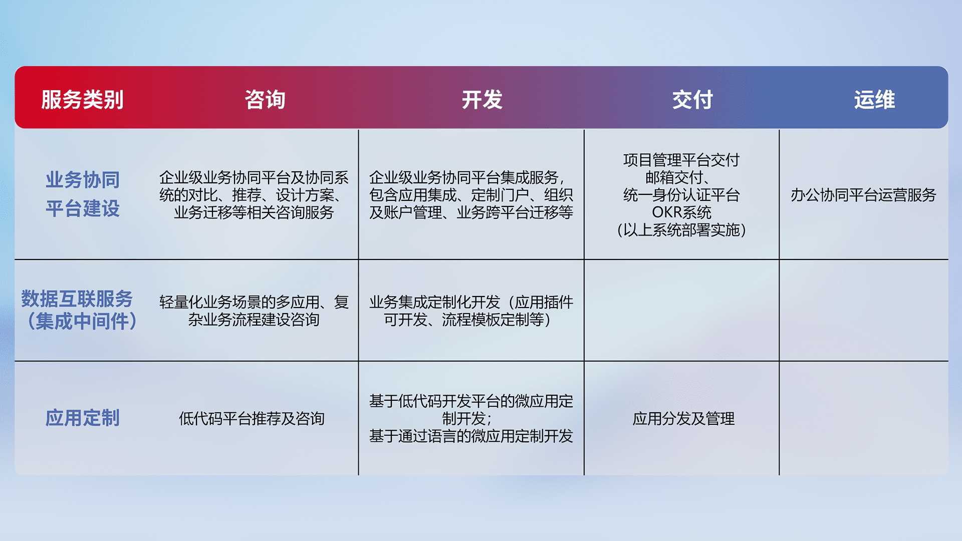 针对钉钉、、、企微、、、、IDaas等平台级产品提供产品的规划、、方案、、交付、、定制化开发等服务,,实现如统一协同办公、、智能客户服务、、、混合会议管理、、、智能数据查询、、、、等业务场景,,,实现数字化转型。。
